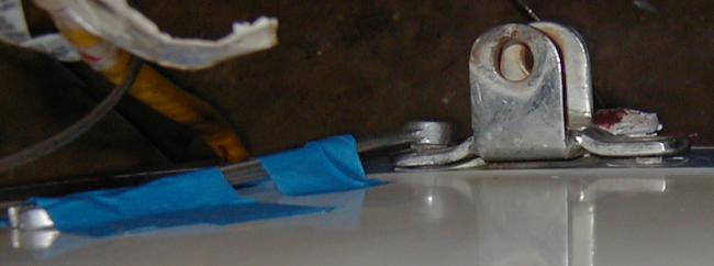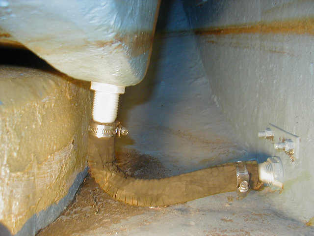 | Here's the hose in place with the hose fitting back in the stern. There's just one problem. Where are the hose clamps?! So now I have to put the hose clamps on way back in this space (this is not an easy place to get to). |