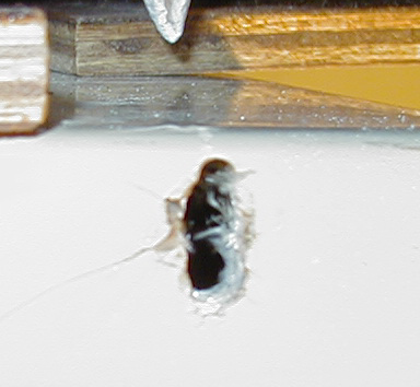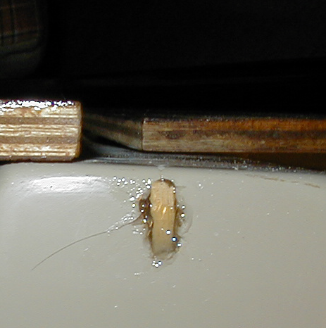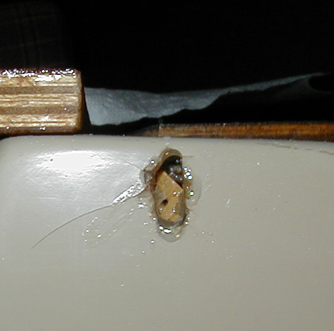 | The hole before any repairs | The small wood chip epoxied in place. | The cavity filled with epoxy and a wood chip. |