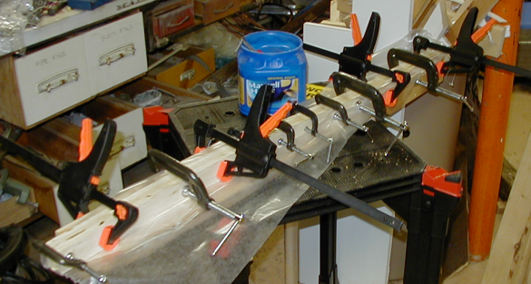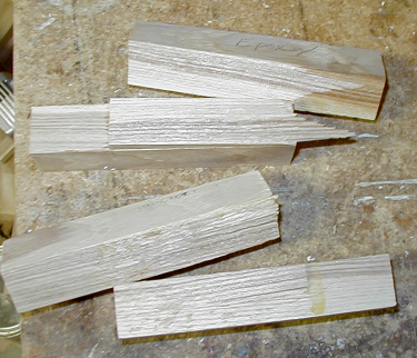 Making a tiller and tiller extensionNovember 30, 2010The tiller that came with the boat is kind of eaten up by the weather and it needs an extension, but the hold-on-to-it end is rather small to be drilling a hole for a tiller extension. The diameter of the tiller is rather small to have a tiller tamer screwed onto it as well. So I've decided to make a new tiller and since I haven't been able to find a tiller extension like I want, I decided to make that too. And I have plenty of white ash which is the right wood for a tiller.So today I started cutting wood. I got most of the cutting done for the tiller extension, but I don't know exactly how long to make it until I get the tiller itself done. I'm going to put a little bit of a upward kink in the tiller so I'll be laminating it to make that possible. I have the basic billets of wood cut. Next I need to rip them into 1/4" thick strips to be laminated (I sure wish I had a table saw). December 8, 2010I was curious about whether Titebond II wood glue would hold as strong as epoxy. It sure is easier to work with - no mixing and cleans up with water. So I put together a little test. I glued some similar blocks together, one set with Titebond, and one set with West Systems epoxy. Once they had a couple of days to cure, I tested the breaking strength with a glommed together tester.I found that the strength wasn't dramatically different, but that the epoxy did seem slightly stronger. I think conventioun wisdom would say that. I know Titebond now has an even better product, so it would be interesting to try that.
