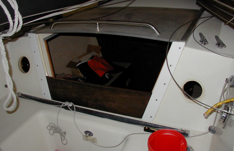 I took the cabin hatch moldings off. They are in pretty bad shape. I think I'll just replace them with StarBoard. No sense in going to all the trouble of removing them and refinishing only to have to do it again in a year or two, and they aren't in very good shape anyway. The hatch boards, I'll refinish even thought they aren't in great shape, they are easy enough to replace down the road.
