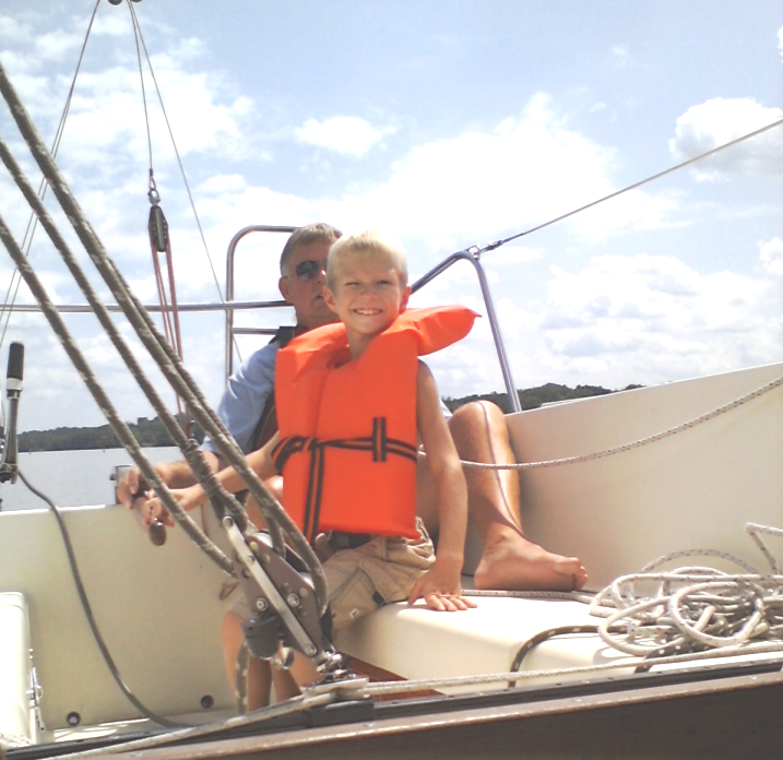 It was probably the last sail of August. I'm really busy with work right now, and we're going to Washington D.C. on Sunday, and I go to Raleigh from there, so I'll be gone most of next week. Such has been sailing this year - between work, weather and lack of mates, there's been too little sailing. Although at least me strategy of keeping the boat on the lake to maximize sailing opportunities has paid off. Sunday was an excellent case in point. We were able to run over to the lake and sail for a couple of hours before it got dark.My son John & grandson Matthew & I went sailing at 11AM this morning. It was perfect weather, although a mild wind. It was enough to get us around, but nothing too much.