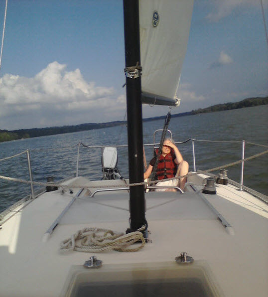 We were in the middle of the lake, Matthew was in the cabin and we heard and felt a loud clunk-clunk. Maybe we hit a log, or maybe the cable for the dagger board broke (the boat has an iron dagger board and I have never even put it down because its not really needed and I didn't want to risk getting it down and not being able to get it up). At any rate Matthew got a little spooked and wanted to go in. After he said he wanted to go in several times, I headed the boat in and called Laura to come and get him. When Matthew was gone, John & I went back out for a couple of hours. We sailed nearly to the end of the lake, tacking the whole way. Coming back, it was wing on wing almost the whole way. We got back down the lake in no time.