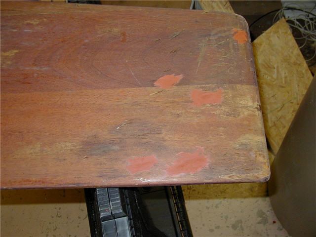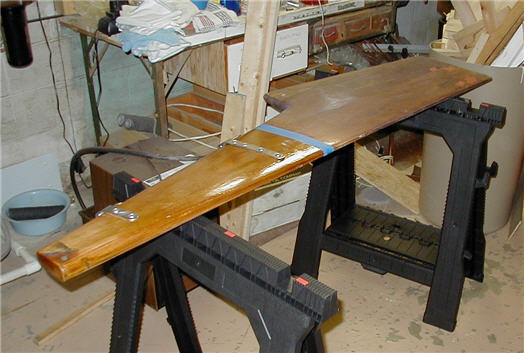 It was originally finished with varnish of some kind. It looked great originally I'm sure, but the varnish can't hold up being in water all summer. So I've ordered Interlux VC-17m anti fouling bottom coat. Its brown so maybe it won't detract from the appearance too much. I'm leaving the top half just finished with varnish. You can see the blue tape where the brown will stop in the photo at right.