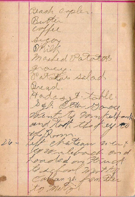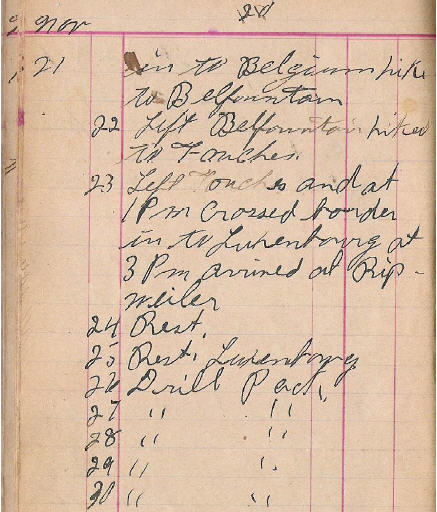 Comments: Here we have mention of the grenade training and automatic rifle training. The first pages in the journal have notes from the hand grenade training and the later pages (87-95) notes from the automatic rifle training. Also note that the handwriting in the journal now changes day by day. The form changes as well as ink to pencil. Now he is keeping a record in this book, day by day. |