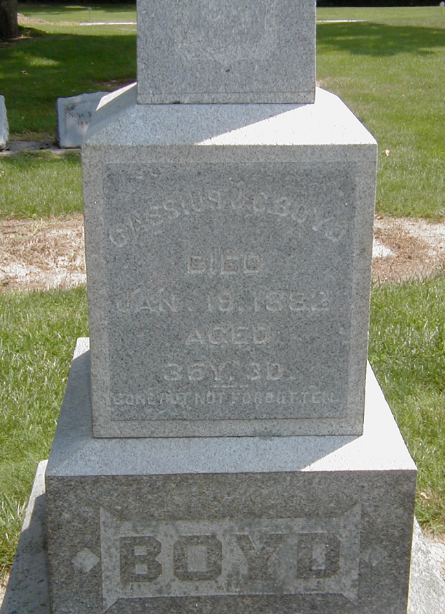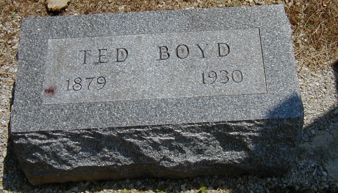 Left of the main monument, Ted Boyd - I don't know how he fits into this family. I've found no record of him. Cassiaus had a son John E., who was born in 1879. Perhaps this is him? |