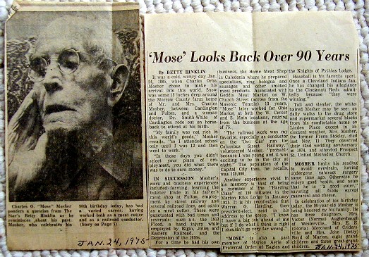 It was a cold, wintry day Jan. 24, 1885, when Charles Orba Mosher chose to make his arrival into this world. Snow was some 15 inches deep around the Morrow County farm home of Mr. and Mrs. Charles Mosher, between Cardington and Fulton, and a woman doctor, Dr. Smith-White of Cardington rode out on horse-back to attned to his birth. "My family was not rich in this world's goods," Mosher recalls, "so I attended school on until I was 12 and then wen to work." "in Those days you didn't select your place of employment, you did what there was to do to earn money." -:- In succession Mosher's work and business experiences included farming, learing the butcher trade in his father's meat shop at Fulton, employment by street railway and several railroad lines, and again as a meat cutter. These were puntcuated with bad times and reversals; such as the 1913 Flood, a hand injury while employed by Elgin, Joliet and Eastern Railrod, and the Depression of the 1930s. For a time he had his own business, the Home Meat Shop in Caledonia where he prepared specialties, ring bologna and sausages and other smoked meat products. Associated with Geddis Meat Market on W. Church Steet (acresso from the Masonic Temple) 13 years, "Mose" later worked for Ohio Market at both the W. Center and S. Main locations, retireing from the business at the age of 75. "The railroad work was my favorite, especially as conductor on the 'Owl Car' run for Columbus Street Railway," volunteered Mosher, "probably because I was young and it was exciting to be in the city at night." The population of the Capital City then, he recalls was 125,000. Another experience vivid in his memory is that of being a member of the "Harding Class" of 150 intiates in the Marion Elks Lodge in January, 1921. It is his recolleciton that Warren G. Harding, then president-elect, said in his address to the group, "I know I have a big job ahead of me but if I do what I think is right I shouldn't go very far wrong." -|- "Mose" is also a past member of Marion Aerie of Fraternal Order of the Eagles and the Knight of Pythias Lodge. Baseball is his favorite sport. Once a Cleveland Indians fan, he has changed his allegiance to the Cincinnati Reds admittedly because "they were winning." Tall and slender, the white-haried Mosher may be seen on daily walks to the drug store and supermarket several blocks from his comforatble home on Linden Place except in inclement weather. Mrs. Mosher, the former Frena Stokley, died las Nov. 11. They observed their 52nd wedding anniversary in 1974, and attended Prospect St. United Methodist Church. -|- Mosher limits his reading to avoid eyestrain, having undergone cataract surgery some time ago. Otherwise he enjoys good health and notes that he is "a good eater," savoring all foods except macaroni and cheese. In celebration of his birthday today, the 90 year-old Mosher is being honored by his family. He has three daughters three daughters, Mrs. Victor (Norma) Aughenbaugh, of Westerville, Mrs. E.E. (Gloria) Merchant of Cridersville and Mrs. John (Betty) Boyd of Marion, eight grandchildren and three great-grandchildren |
