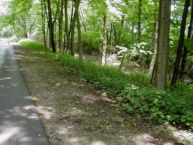 | This shows a bike path that follows the old rail bed and canal tow path. The canal can be seen to the right. |